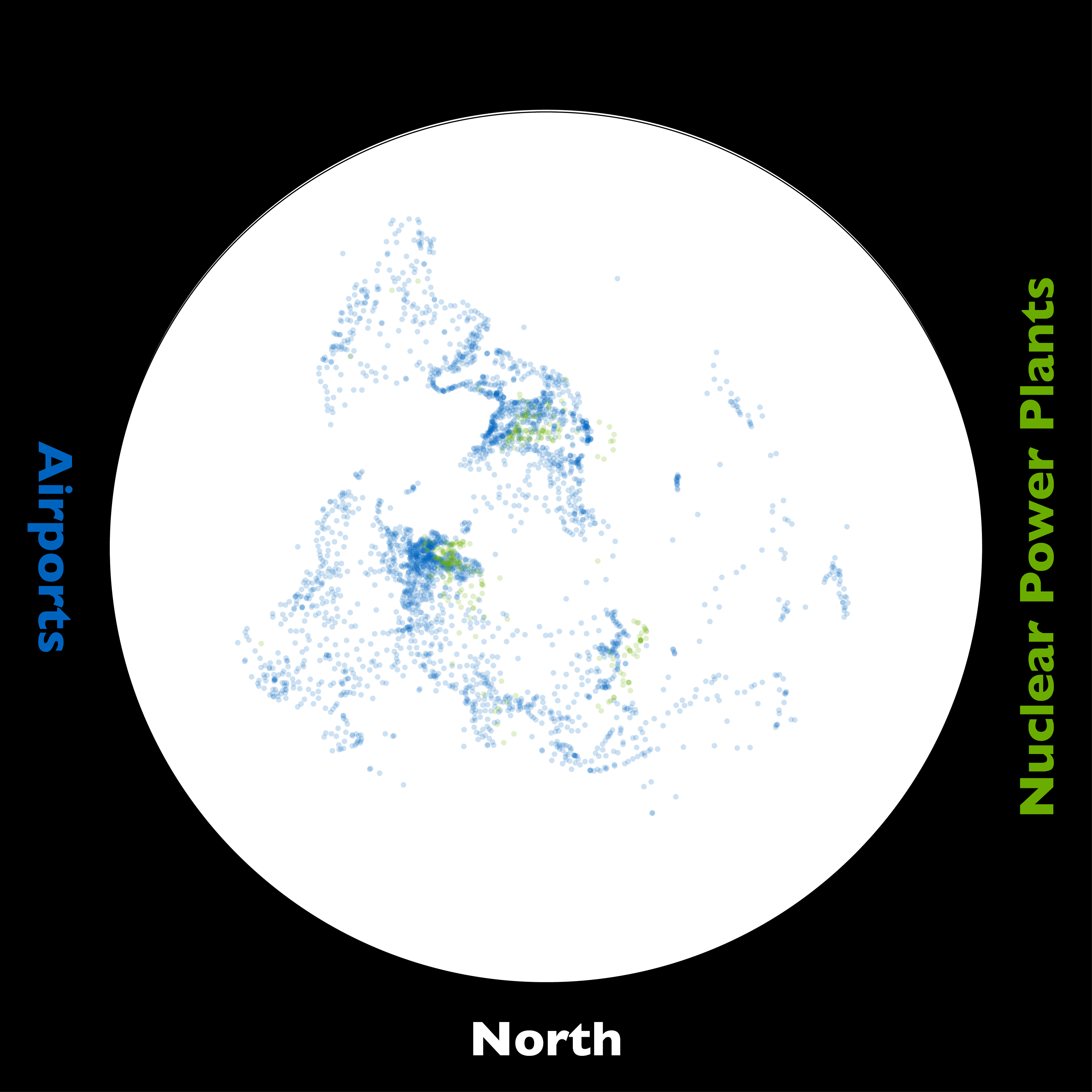 The project drew comparisons between different geographic data sets. The example above compares the distribution of resources in North centric and to South centric views. Below is an overlay of air airpots and nuclear power plants. Each one is meant to expose unexpected relationships and provide new perspectives to approach the data.